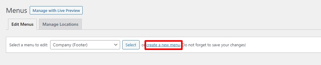 2. Select create a new menu at the top of the page