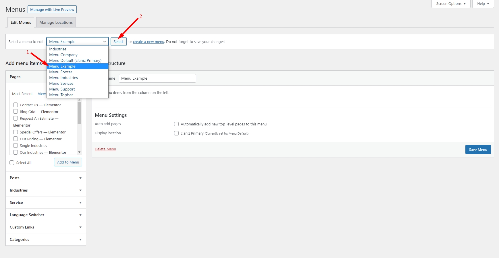 1. From the 'Appearance' menu on the left-hand side of the Dashboard, select the 'Menus' option to bring up the Menu Editor.