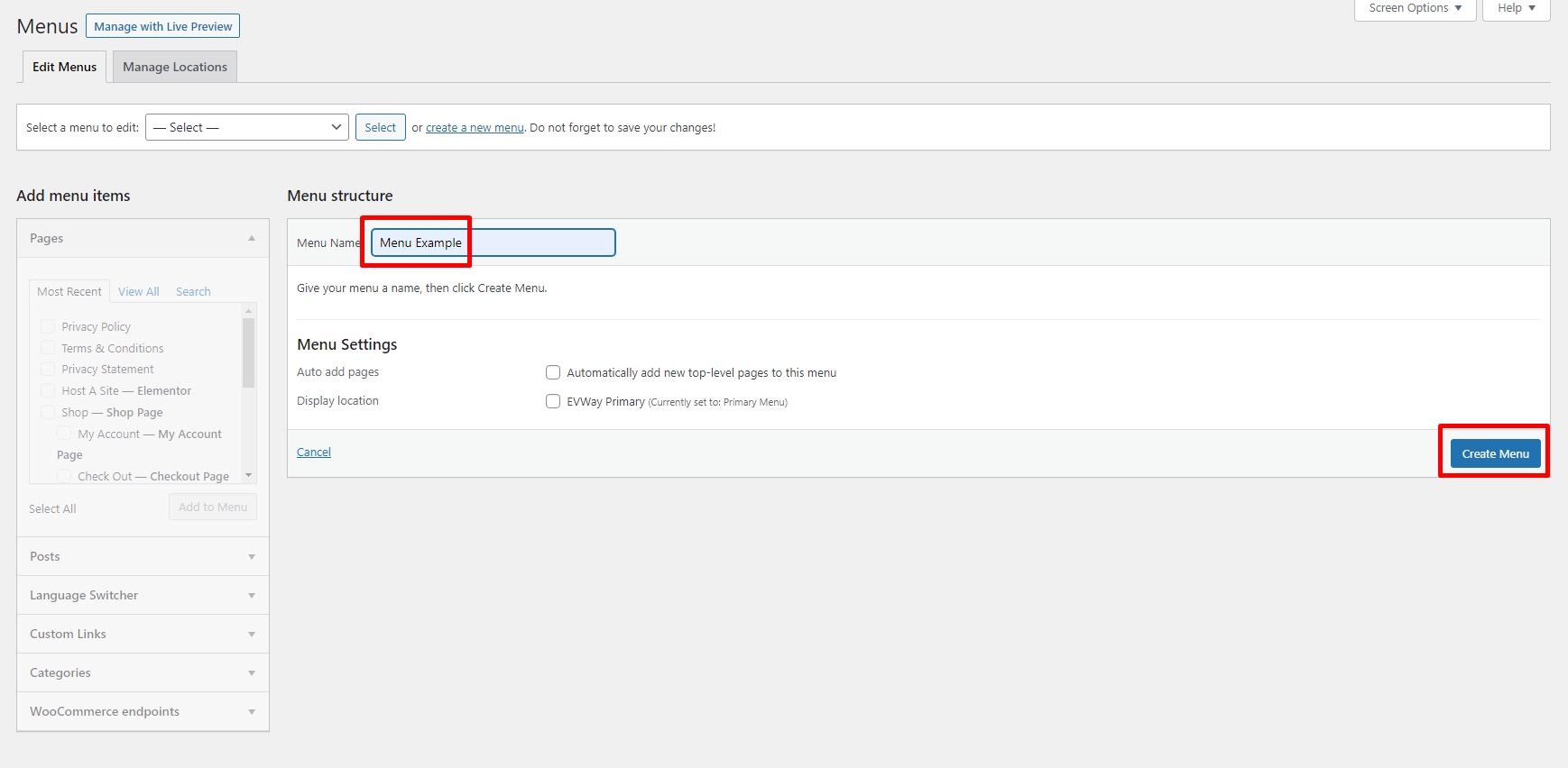 3. Enter a name for your new menu in the Menu Name box.