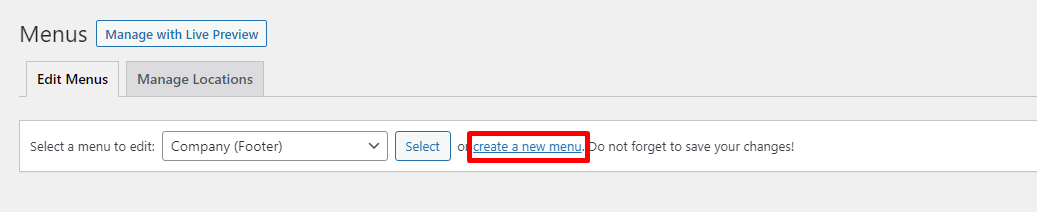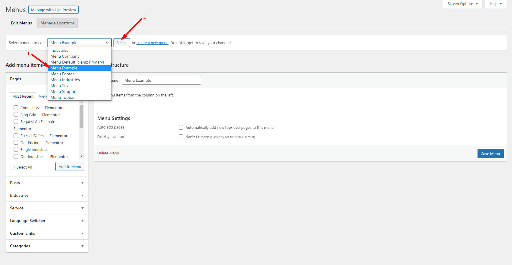 1\. From the '**Appearance**' menu on the left-hand side of the Dashboard, select the '**Menus**' option to bring up the **Menu Editor**.