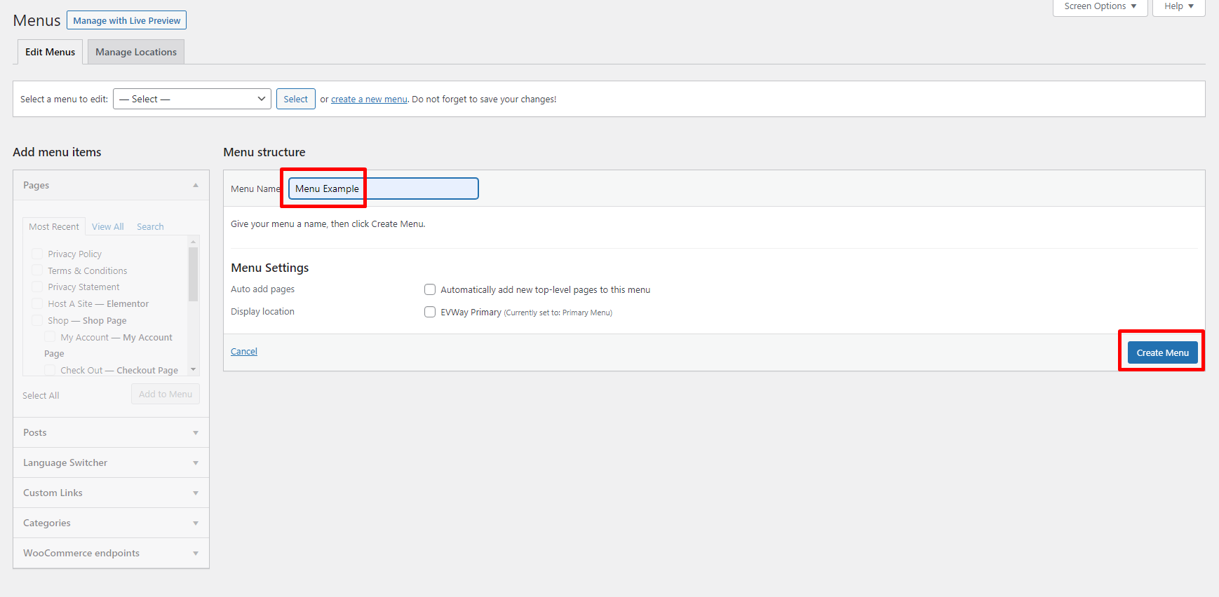 3\. Enter a name for your new menu in the **Menu Name** box.