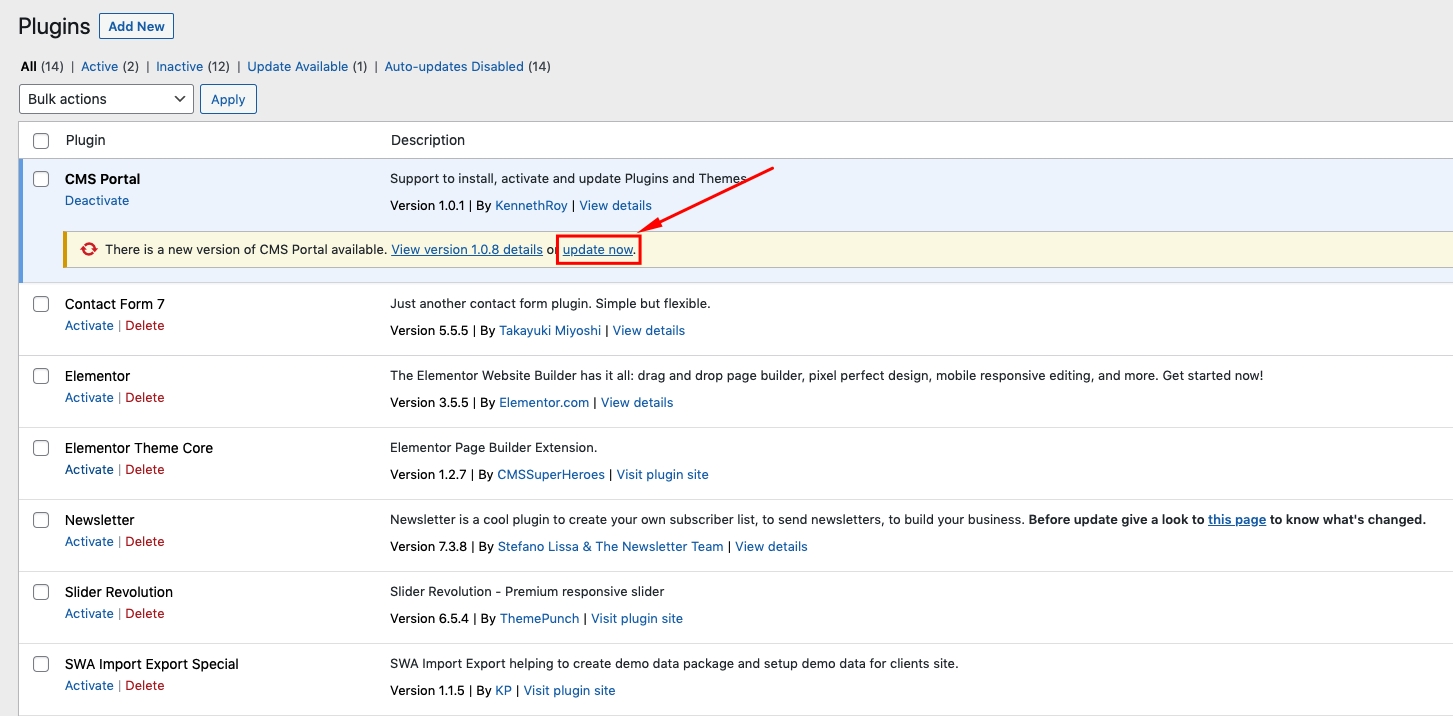 2. Click the update now link inside the yellow alert under each installed Plugin.