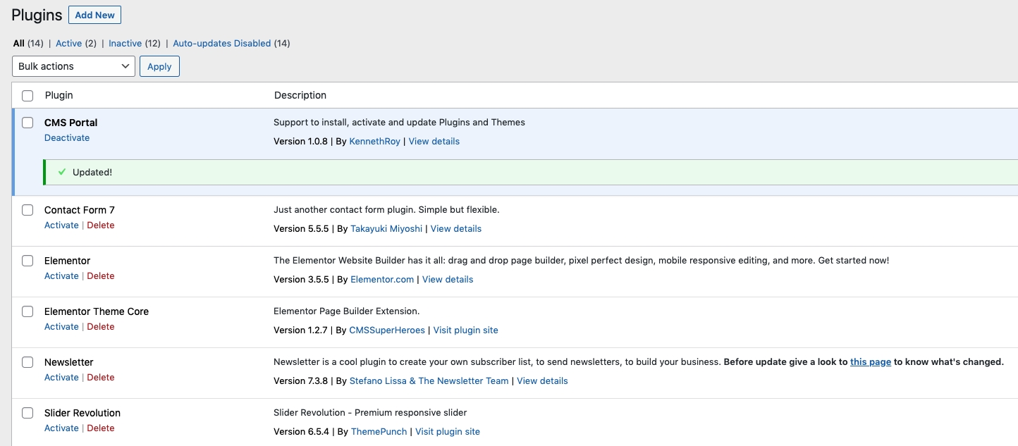 3. When you see the Updated alert show, you are done. Let's continue to do it with other old plugins.