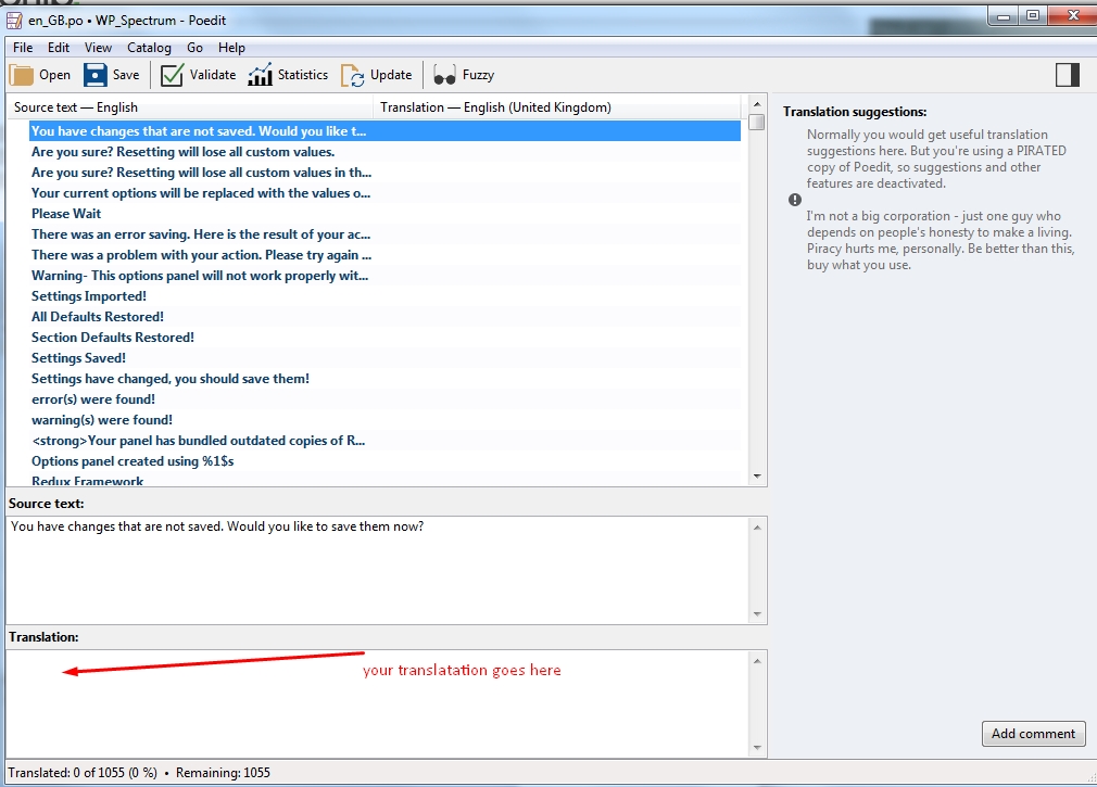 5.3. Now in the Poedit click on original text one by one and write your translation underneath. Just like you can see iu the screenshot below. It will take some time to get through all of them so be patient.